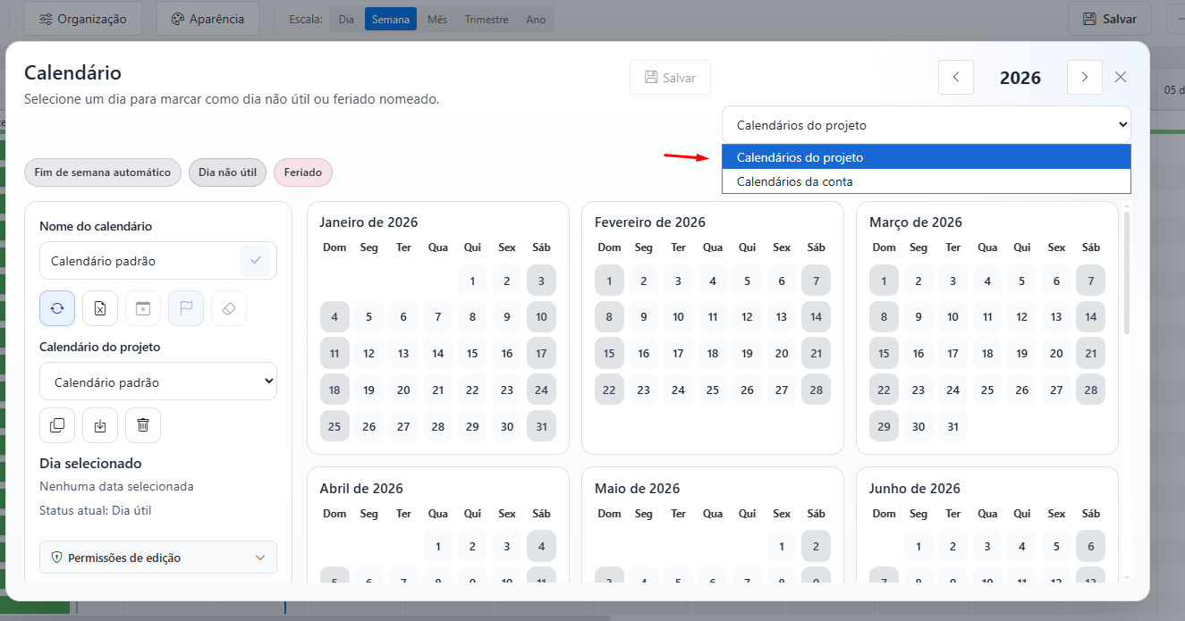 Ao editar localmente o calendário do projeto, ele pode deixar de seguir automaticamente a referência da conta.