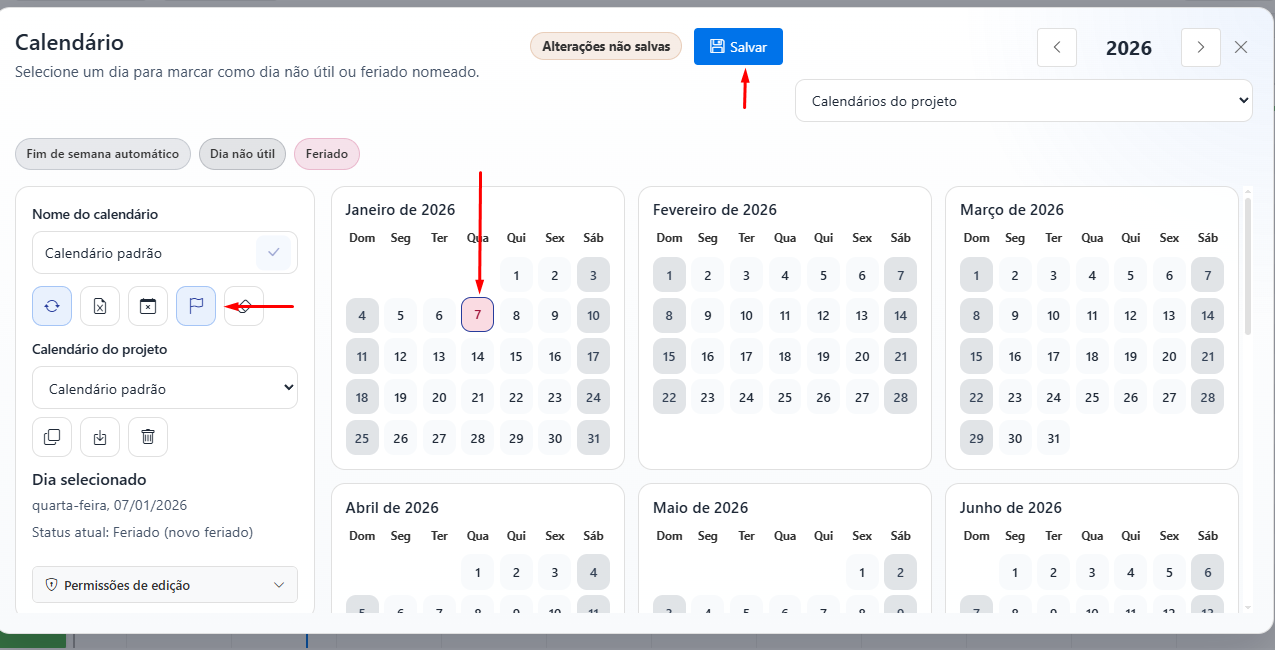 - use o calendário do projeto quando a obra precisar de feriados, dias não úteis ou exceções próprias